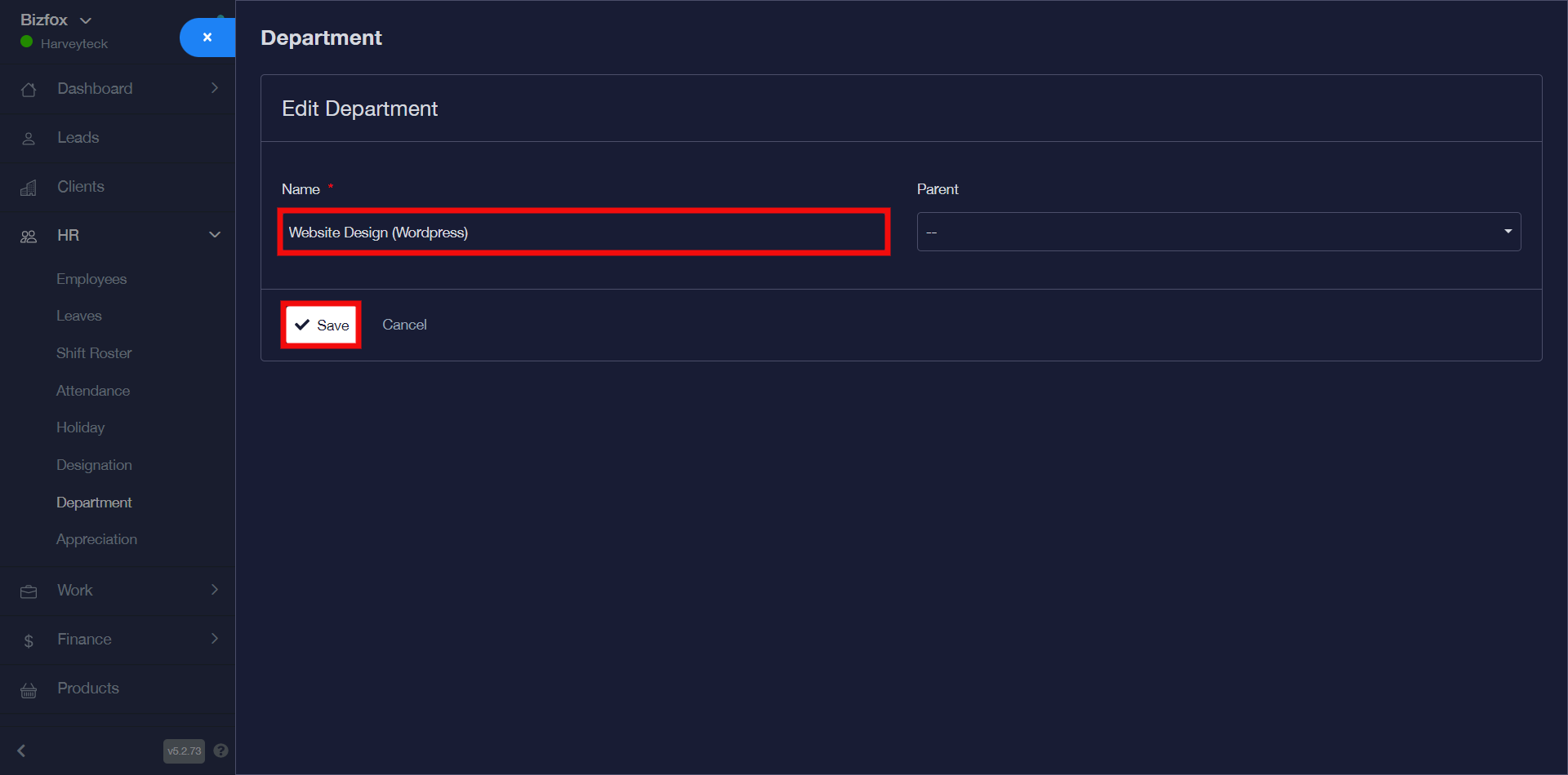 STEP 3: Enter the name of your department and go ahead to select any of the parent departments from the drop-down after which you can click the save button.