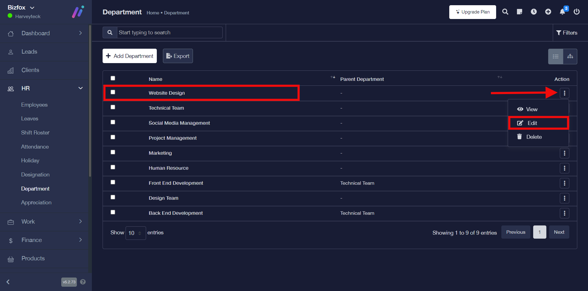 STEP 1: To edit department, click on the “triple dot action button” on the particular department you would like to make changes to then go ahead to click “edit” in the drop-down.