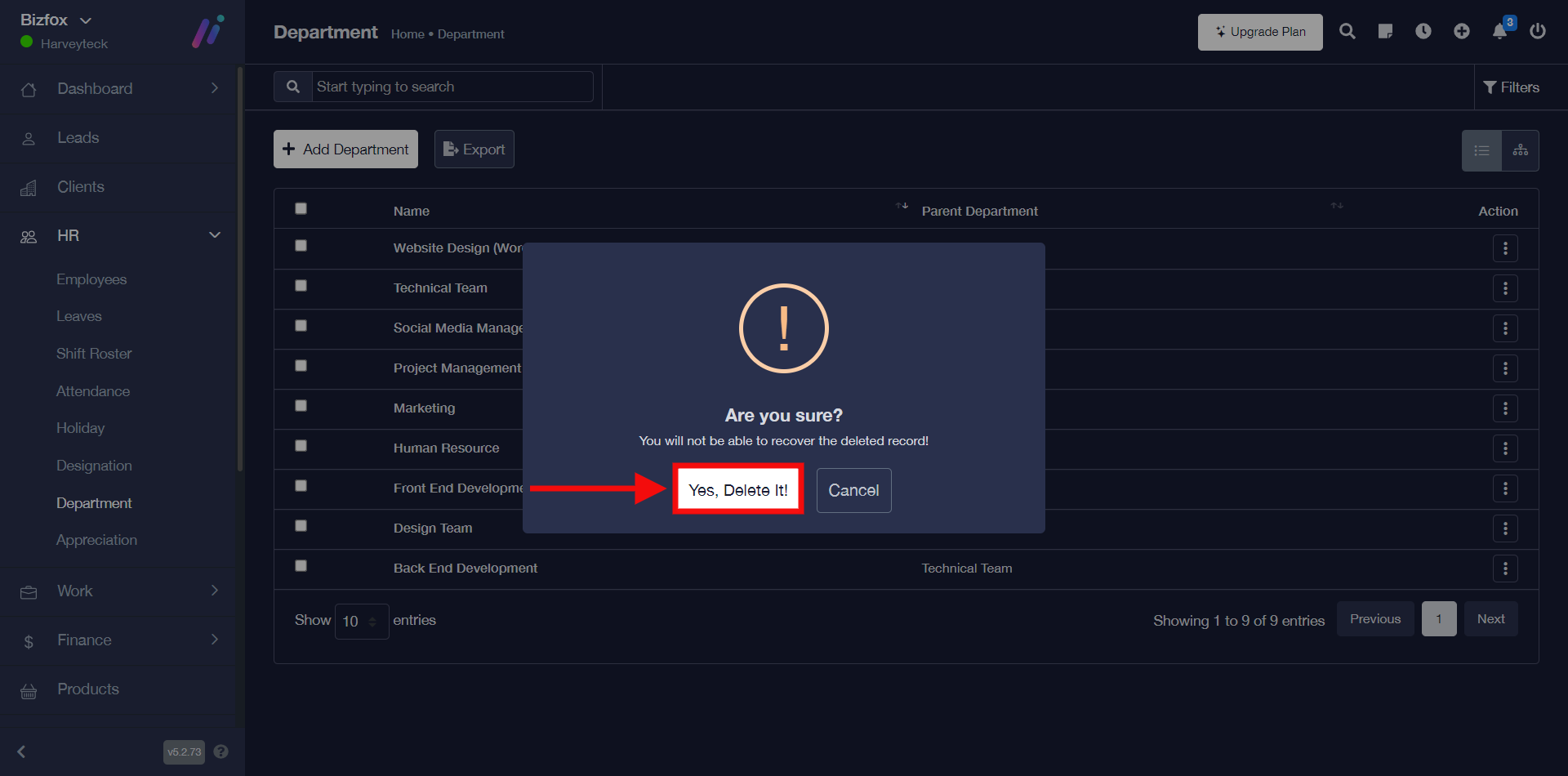 STEP 2: You can go ahead to click on the “Yes, Delete it” button, and then you will see a pop message stating that the department was deleted successfully.