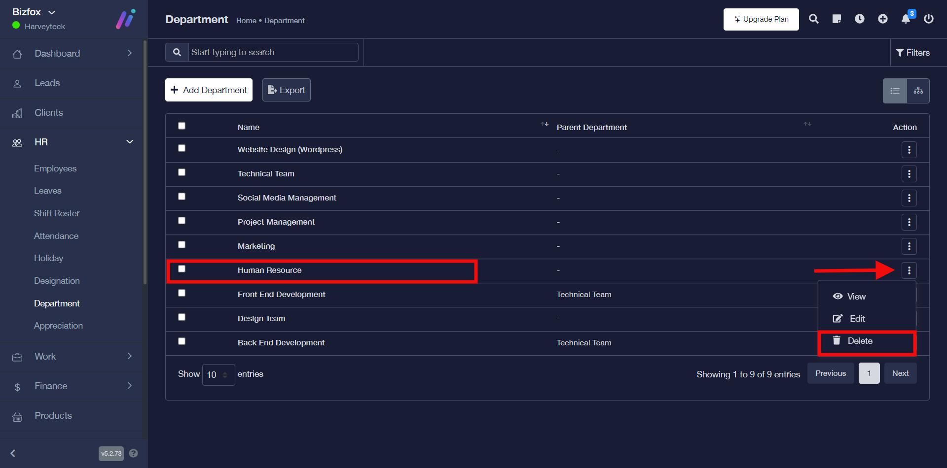 STEP 1: To delete department, click on the “triple dot action button” on the particular department you would like to remove then go ahead to click “delete” in the drop-down.