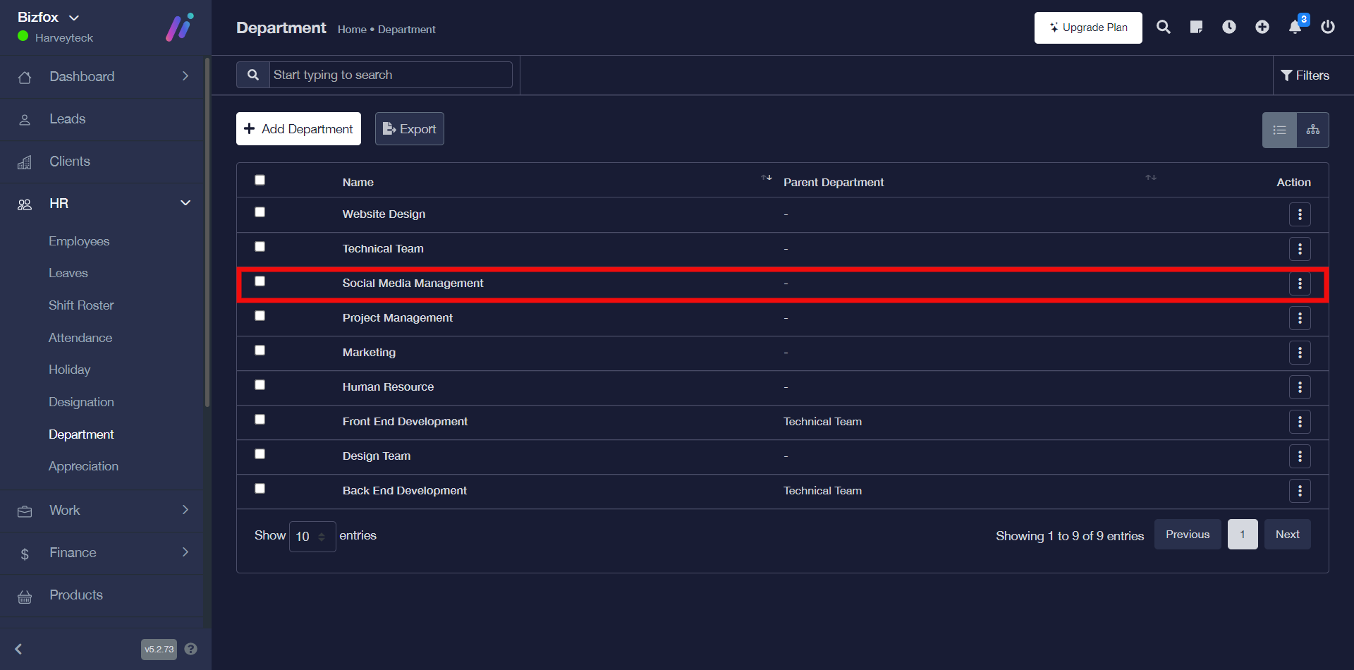 STEP 1: In the left-hand menu, click on “HR” and in the dropdown go ahead to click on “Department” as shown in the screenshot below;