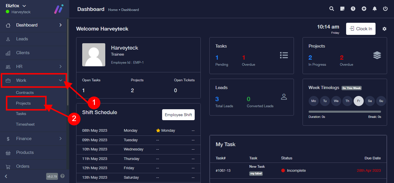 Step 1: After you’ve logged into your Business manager account, it leads you to the dashboard and there you get to see the left nav-bar and a table. On the left-nav bar click on “WORK” dropdown, It takes you to “PROJECT” Click on “PROJECT”