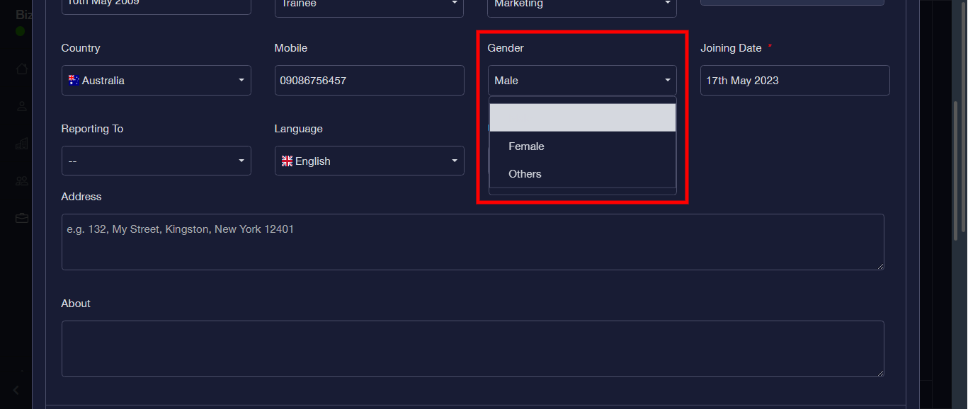 Step 13: Enter Gender from the dropdown