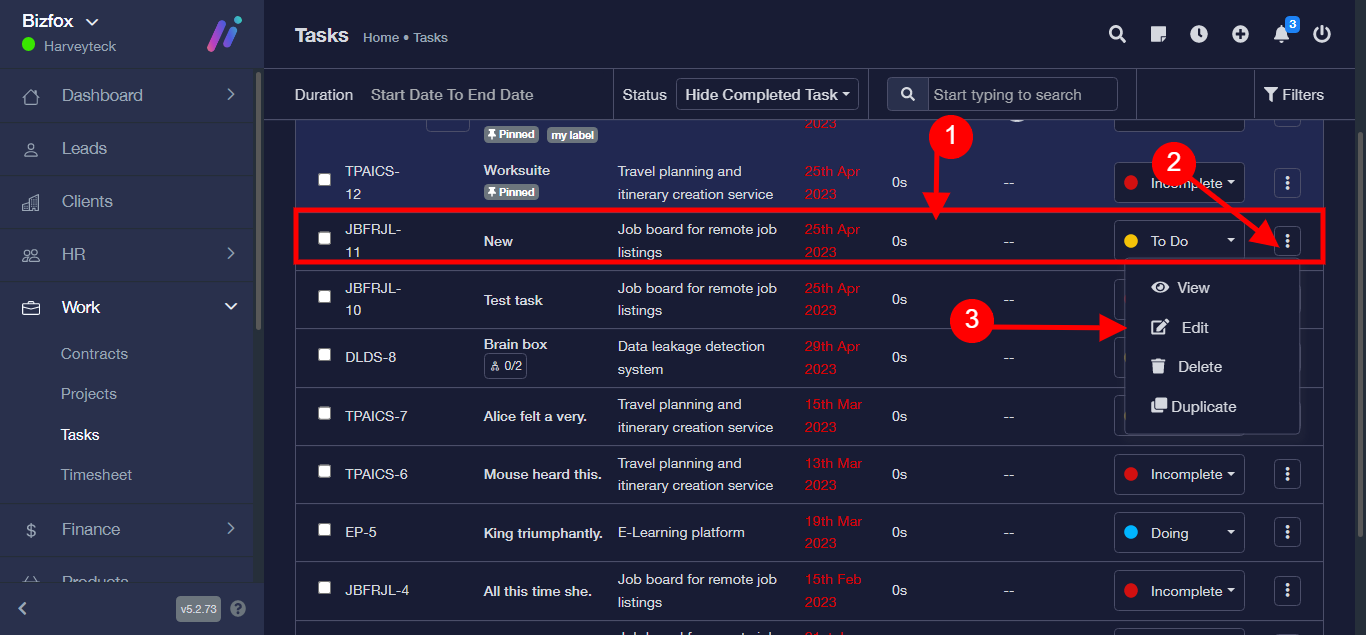 Step 1: After you’ve logged into your Business manager account, it leads you to the dashboard and there you get to see the left nav-bar and a table. On the left-nav bar click on “WORK” dropdown, It takes you to “Task” Click “Task”