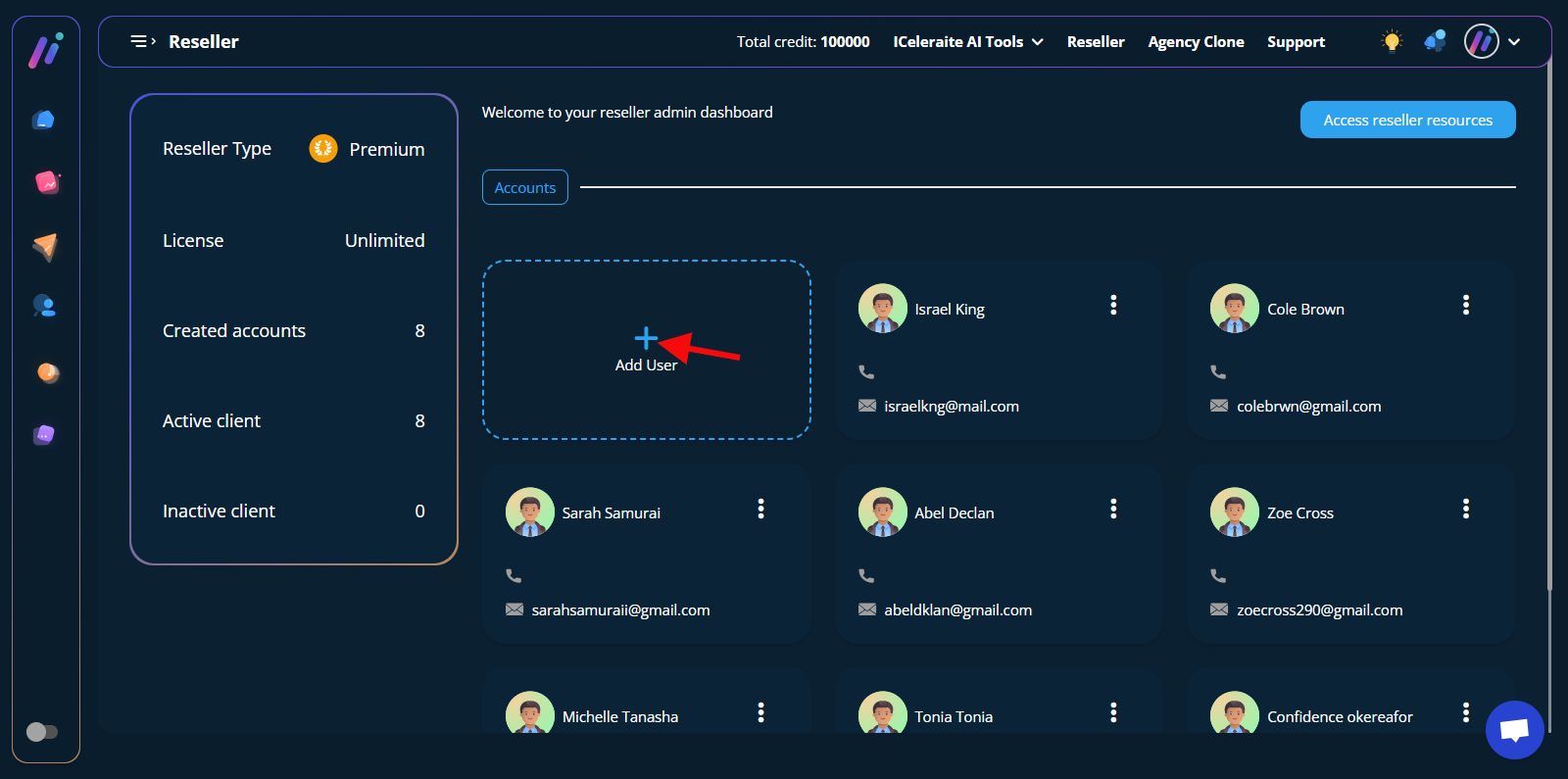 Step 2: You will be taken to the reseller panel. Click on the “add user” card