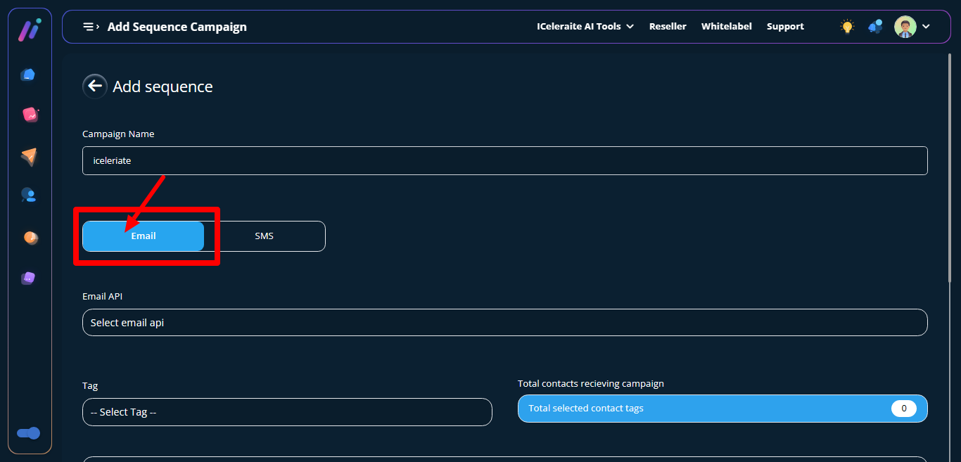 Choose Sequence type (Email/SMS) as email