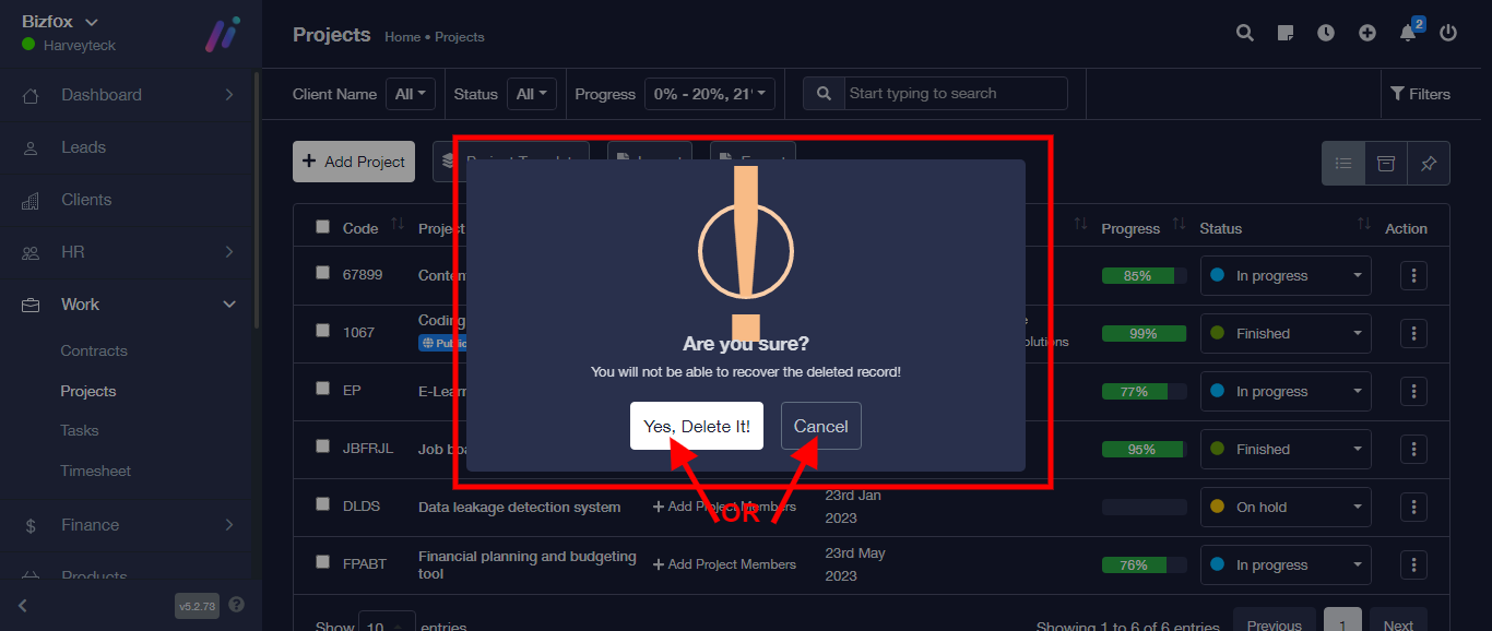 Step 3: From the pop-up modal, Select “Yes Delete It” to delete project or Select the “Cancel” to cancel process.