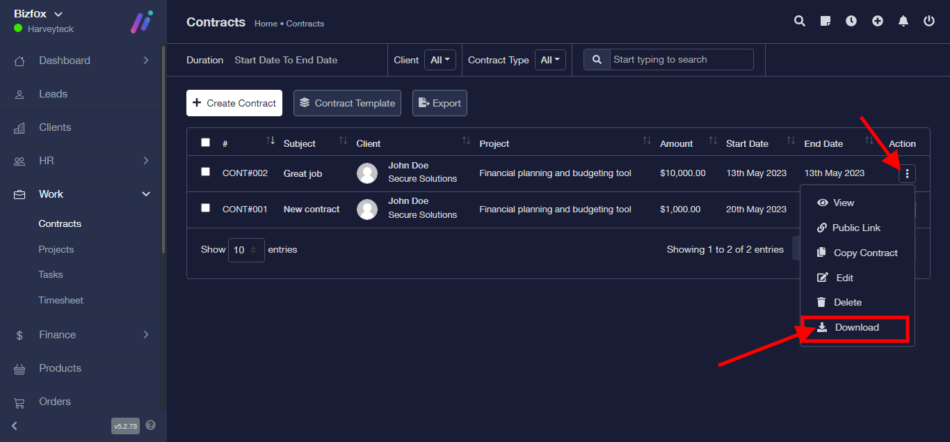 Step 1: After you’ve logged into your Business manager account, it leads you to the dashboard and there you get to see the left nav-bar and a table. On the left-nav bar click on “WORK” dropdown, It takes you to “CONTRACT” Click on “CONTRACT”