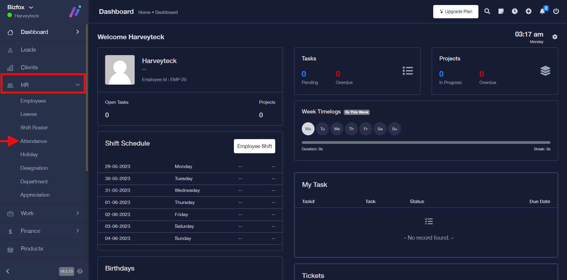 STEP 1: In the left-hand menu, click on “HR” and in the dropdown go ahead to click on “Attendance” as shown in the screenshot below;