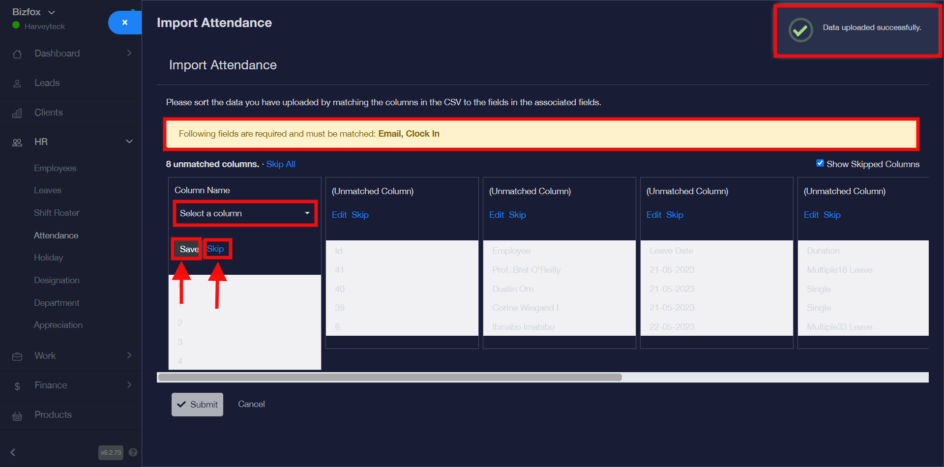 STEP 4: You will see a pop-up notification stating that the data uploaded successfully, as you can see in the screenshot below there are five columns. You can edit any column of your choice and select a field and click the “save” button for the respective columns.