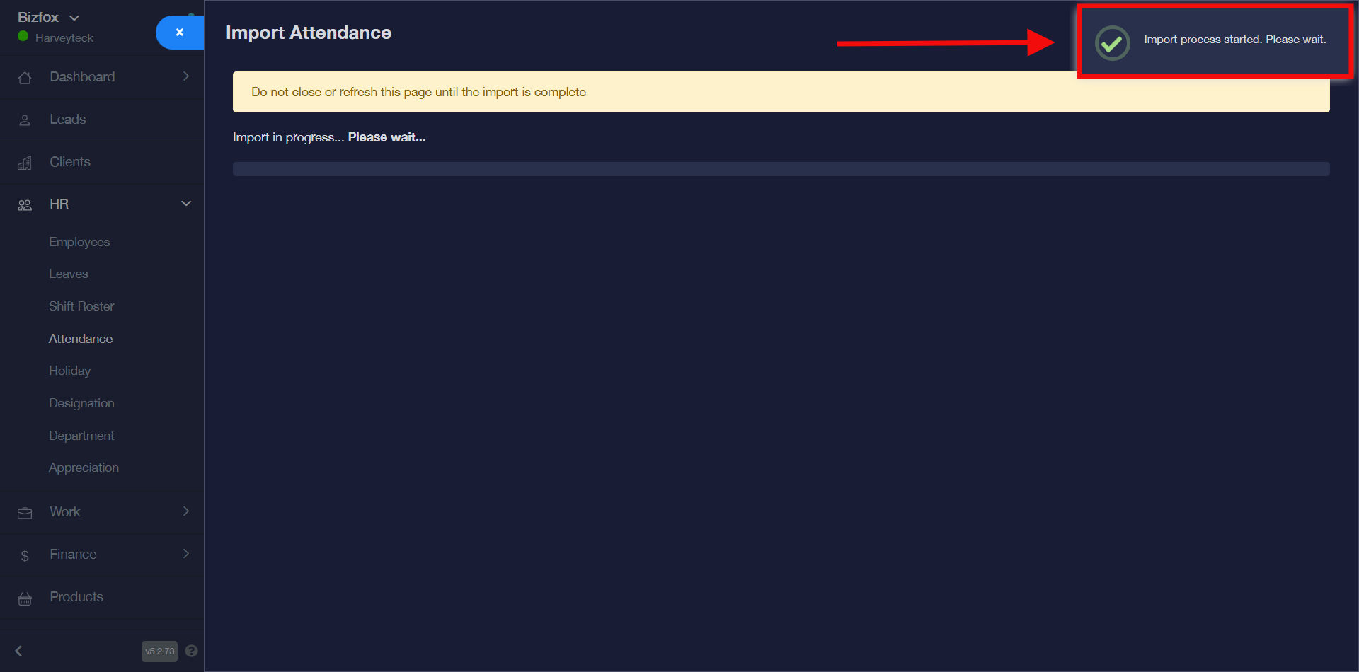 After clicking on the sumbit button, you will see the success pop-up message stating that the import process has started and in a few seconds you will also get another success pop-up message stating the import has been completed.