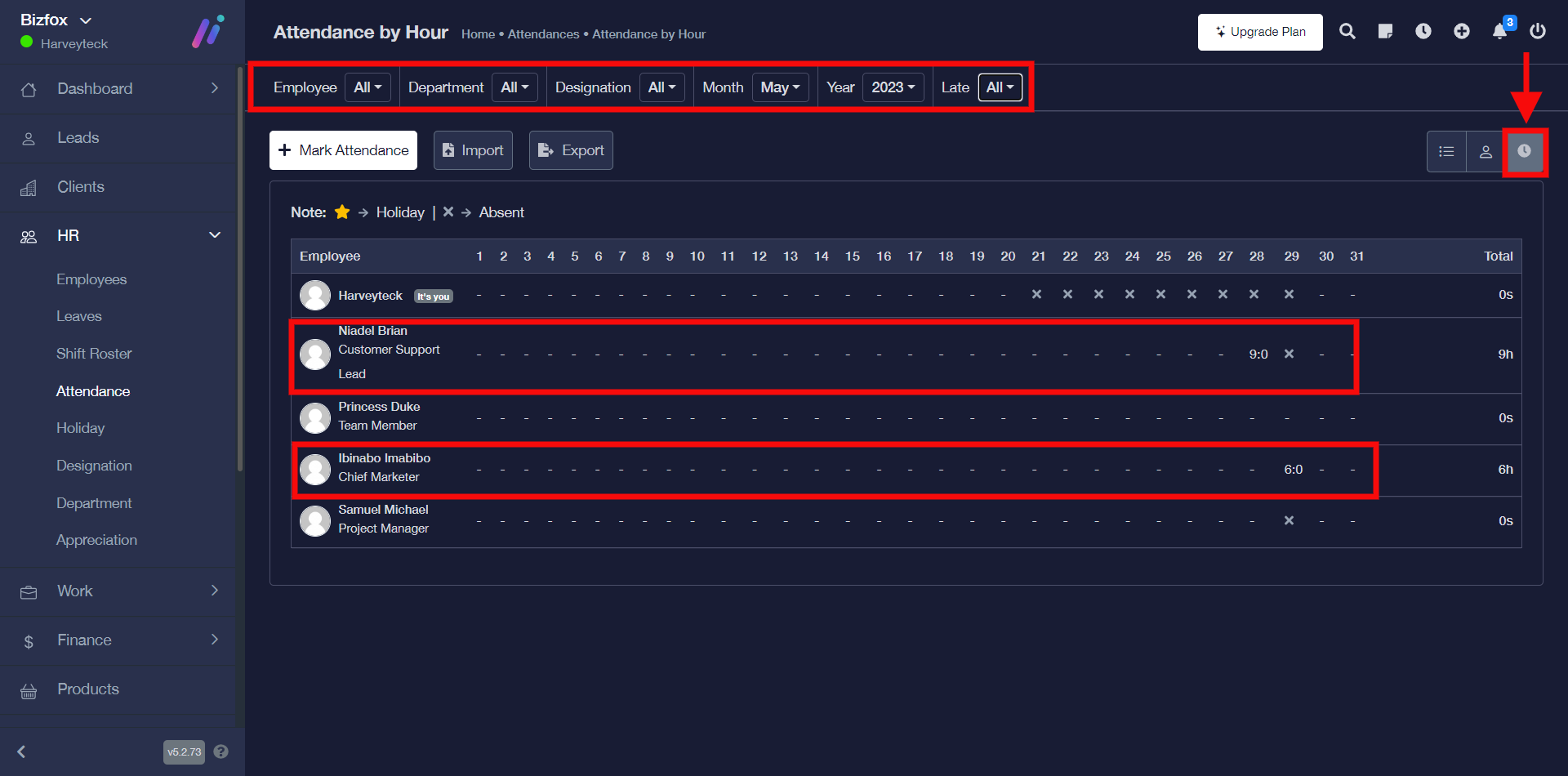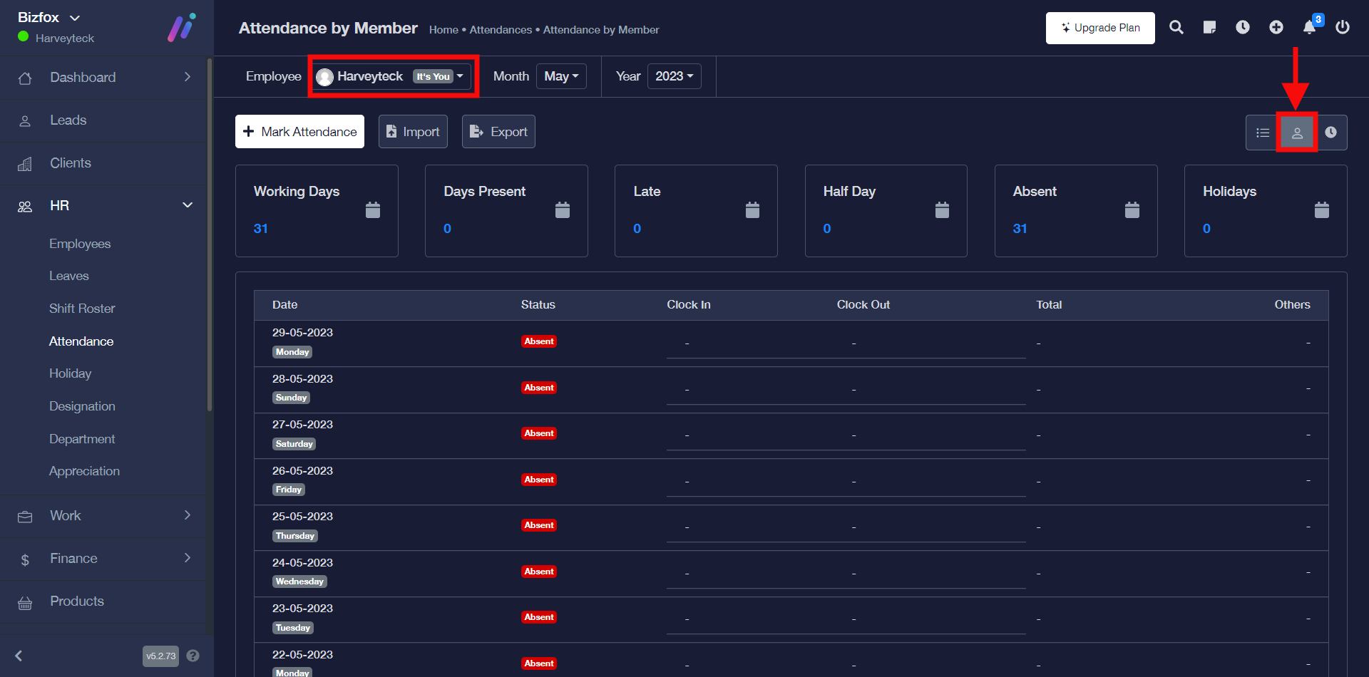 STEP 1: Go ahead to click the “attendance by member” icon. You can filter the result by employee, month, and year.