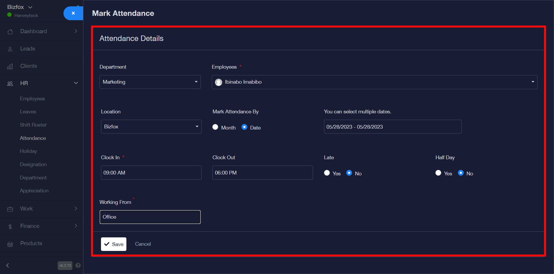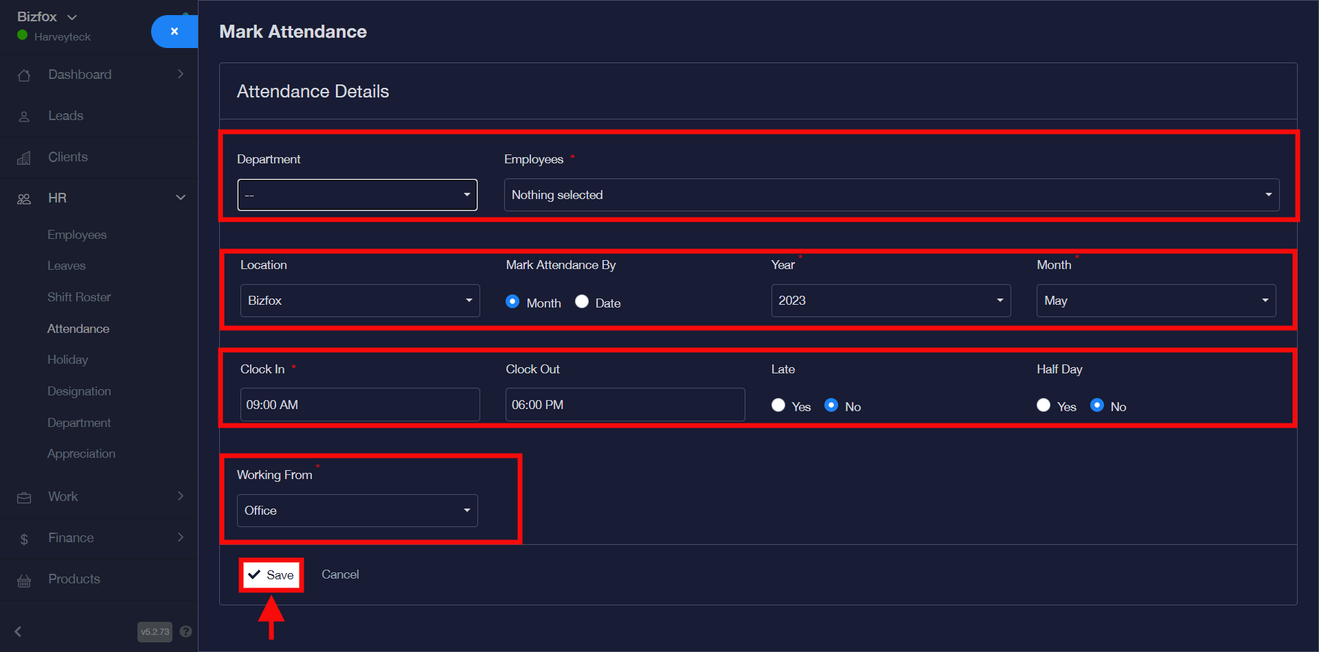 STEP 2: You can go ahead to select the department and employee(s) you’d like to mark attendance for, after which you can select the business location and choose to either mark attendance by month or date, select clock in and clock out time as well as the late and half day option then the working from office or home option then you can click the “save” button.