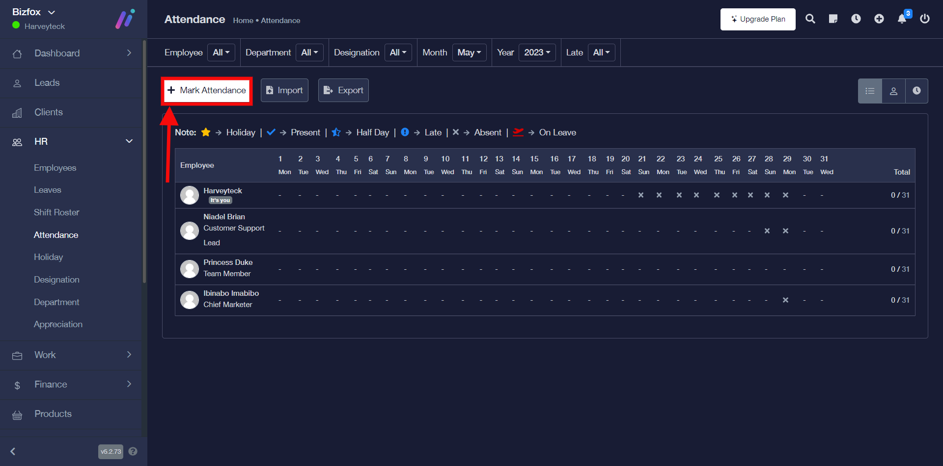 STEP 1: Go ahead to click the “mark attendance” button, after which you will see a window where you can enter attendance details for any department and employee of your choice.