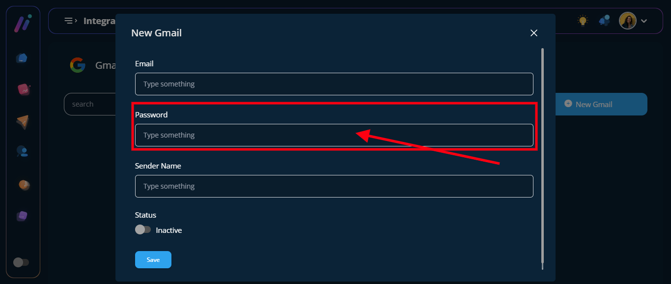 Copy the password and enter it into the password field in the Gmail integration