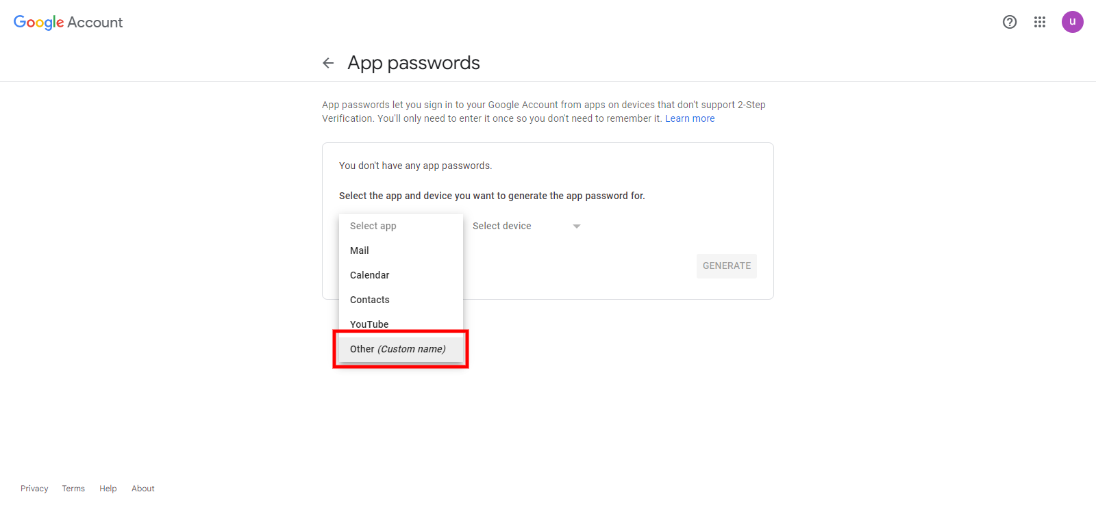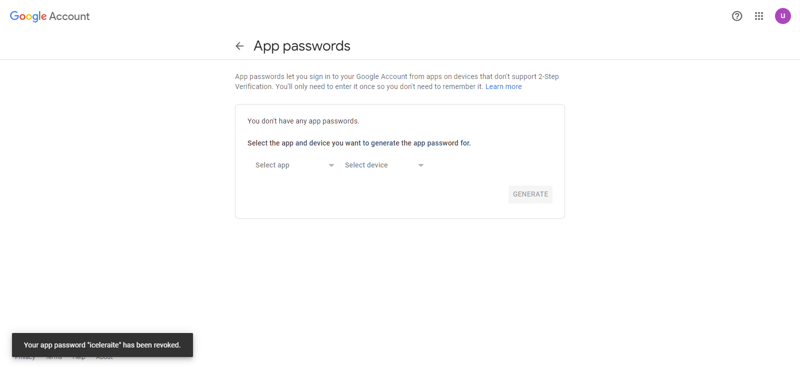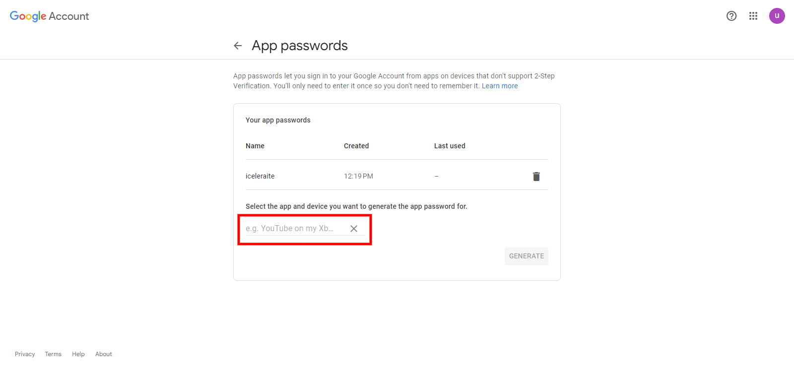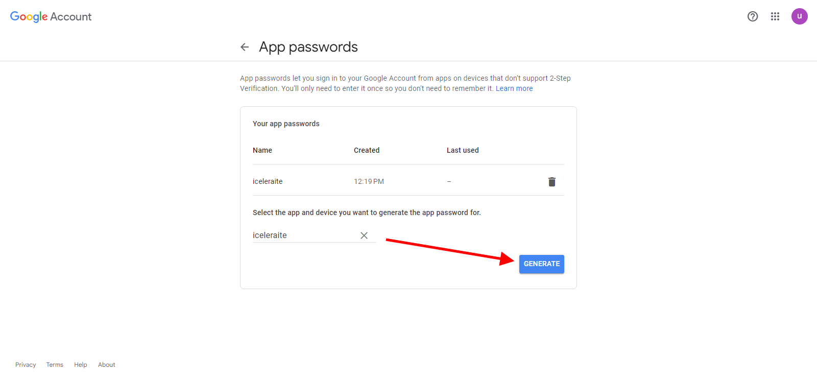 You will be taken to this page to generate the app password