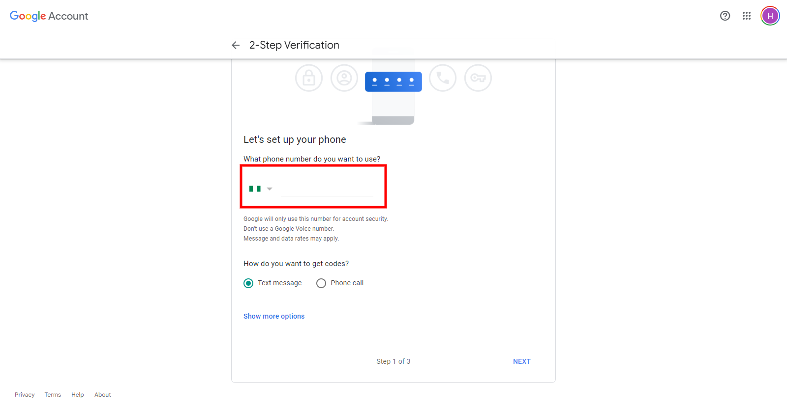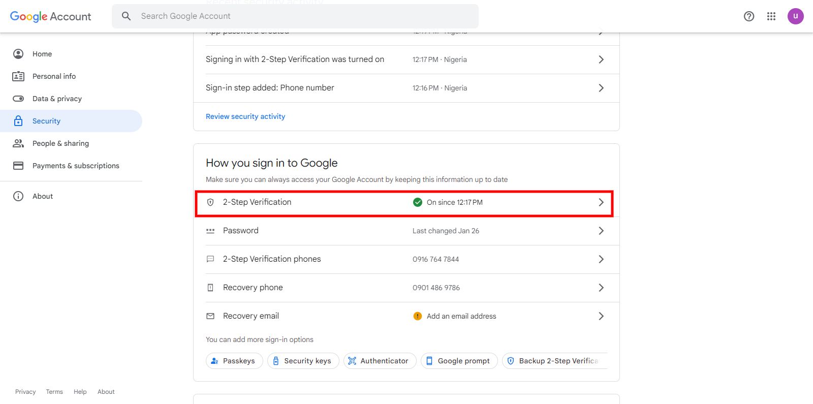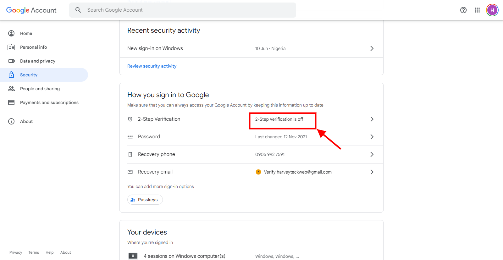 Action 4:  Click on 2-step verification (if indicated off)