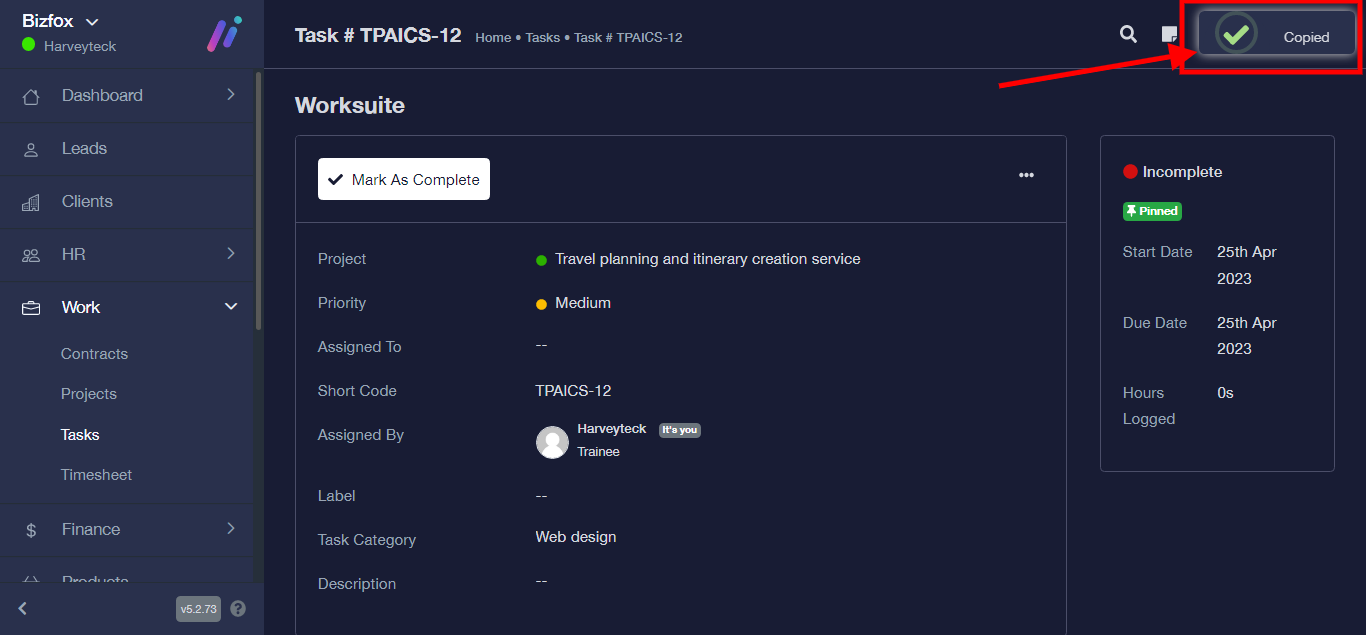 Task Link successfully copied and can be shared where necessary
