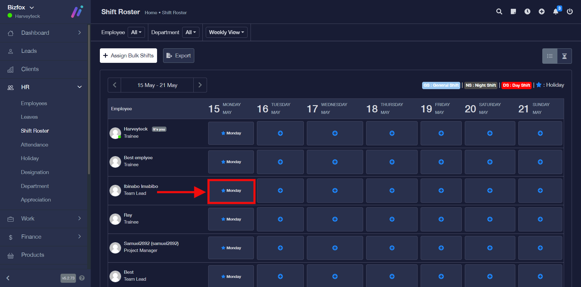 STEP 1: In the left-hand menu, click on “HR” and in the dropdown go ahead to click on “Shift Roaster” as shown in the screenshot below;