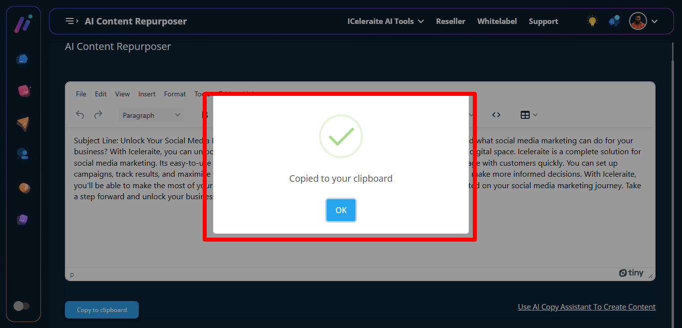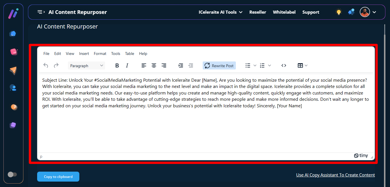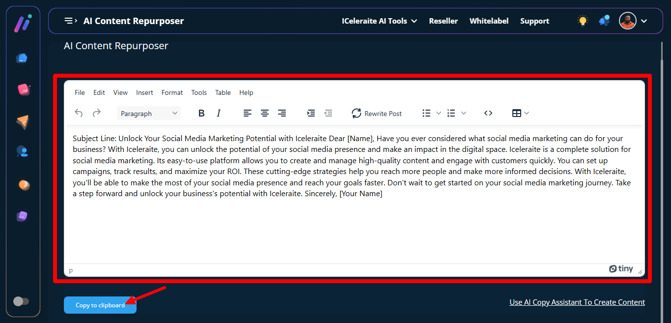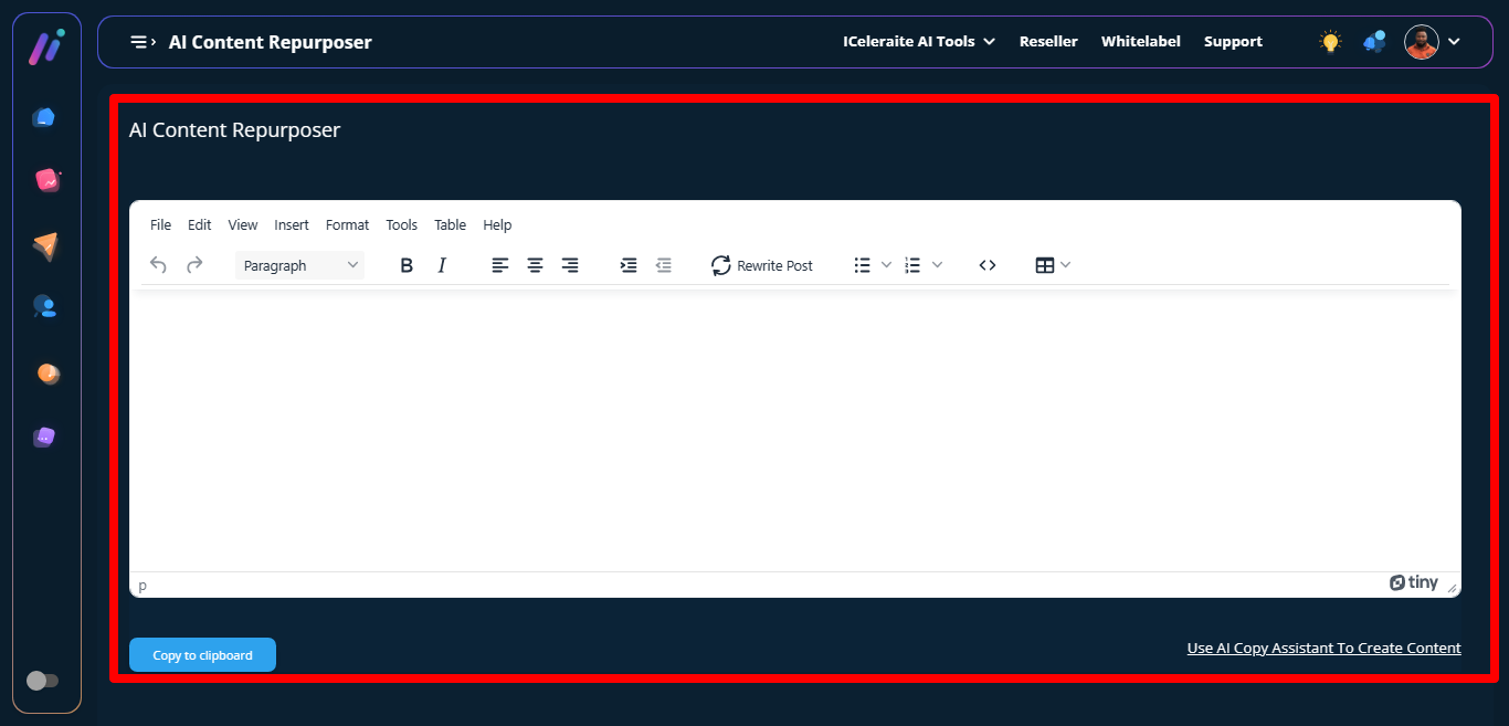 STEP 2: Then the AI Content Repurposer page will appear, you can either paste an already written content then click on rewrite post to restructure the content or click on “use AI copy assistant to create content” to create content.