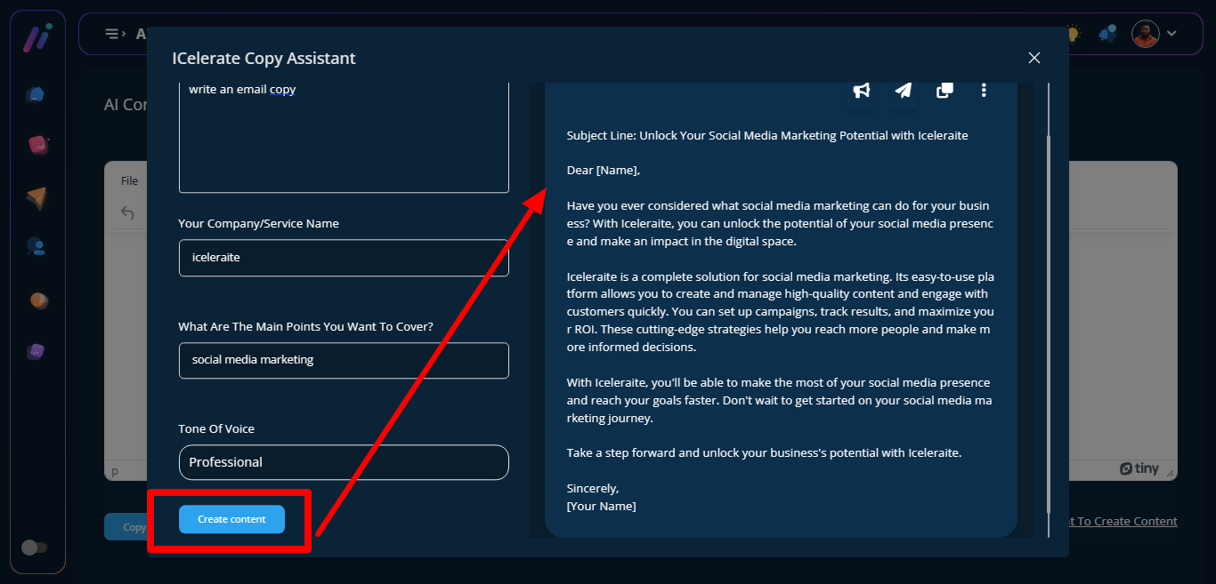STEP 5: Click on the create content button to help generate content, you can either broadcast, share, copy, save and delete the already generated content.