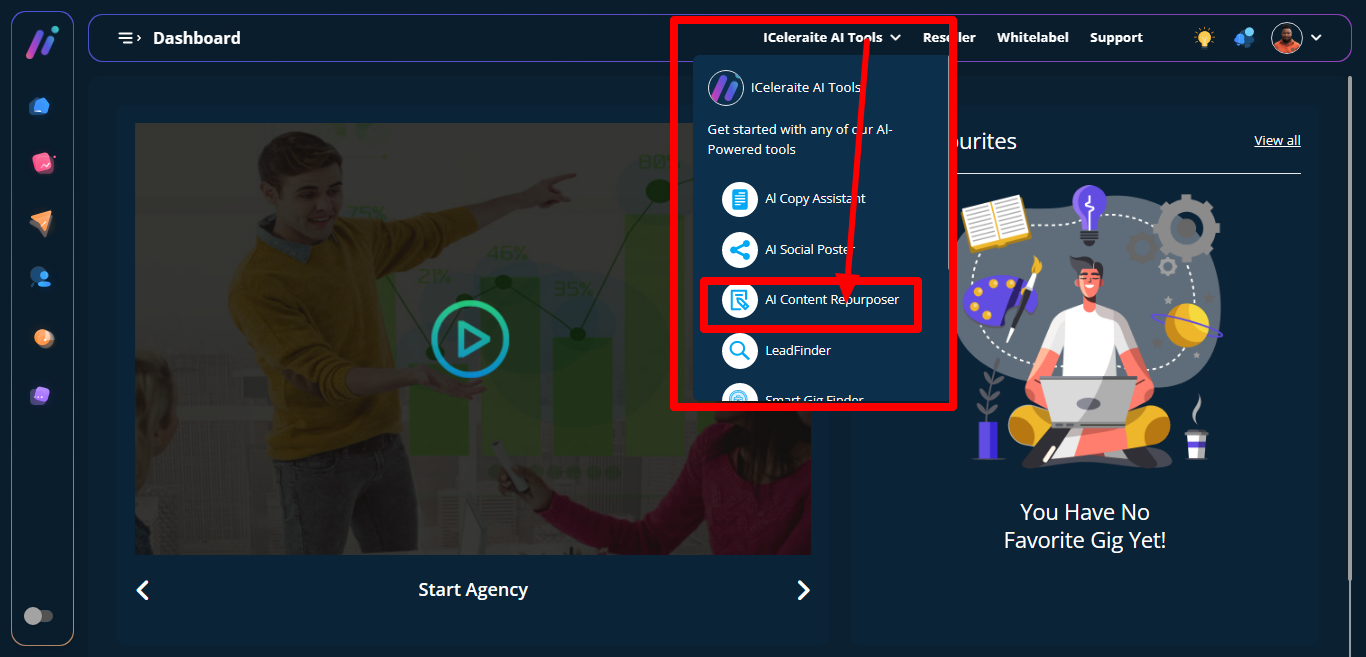STEP 1: The AI content repurposer is used to generate or rewrite contents, you can access it from the top section. When you click on the iceleriate AI Tools a dropdown will appear showing different AI options. Click on AI content repurposer.