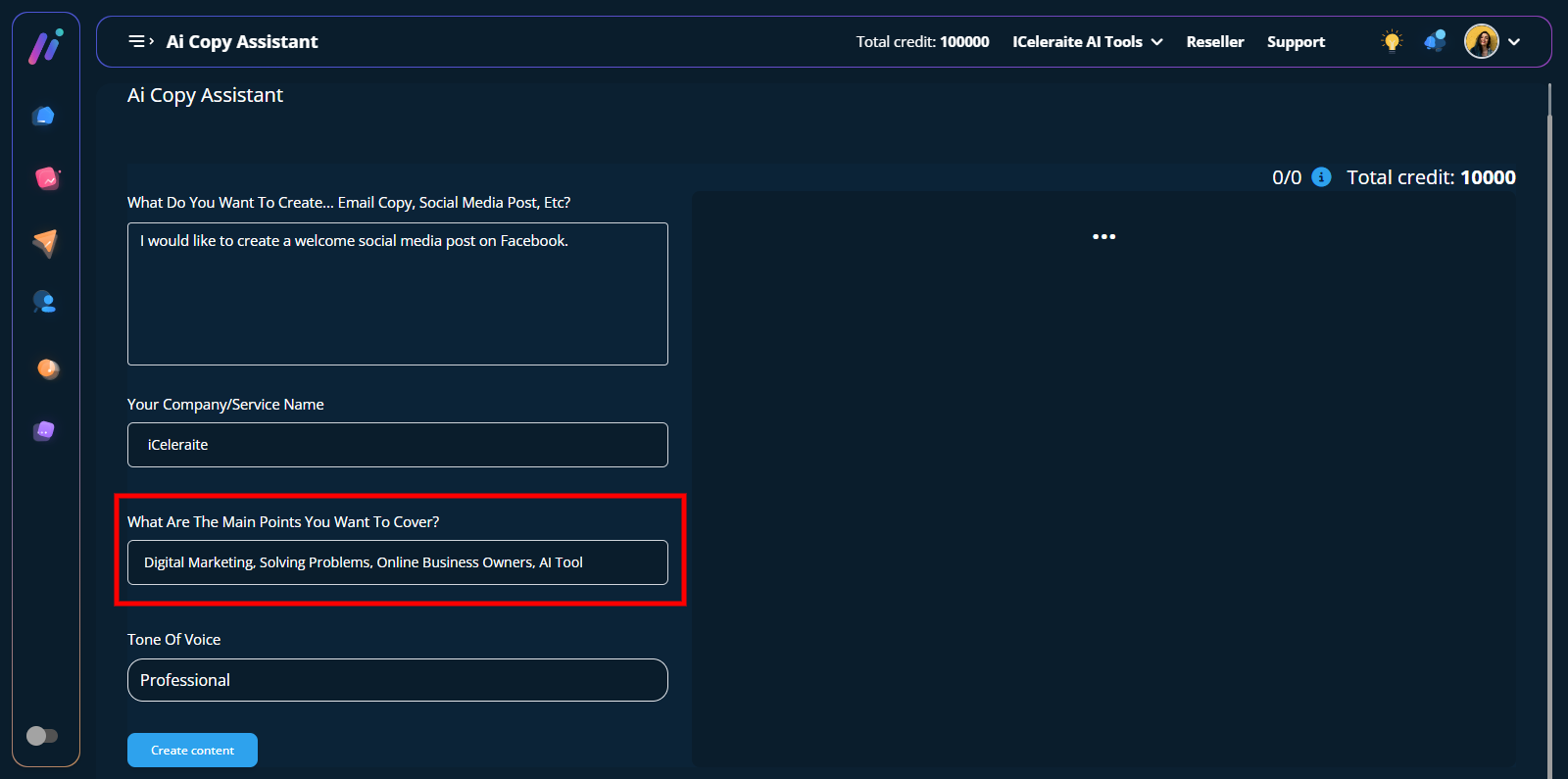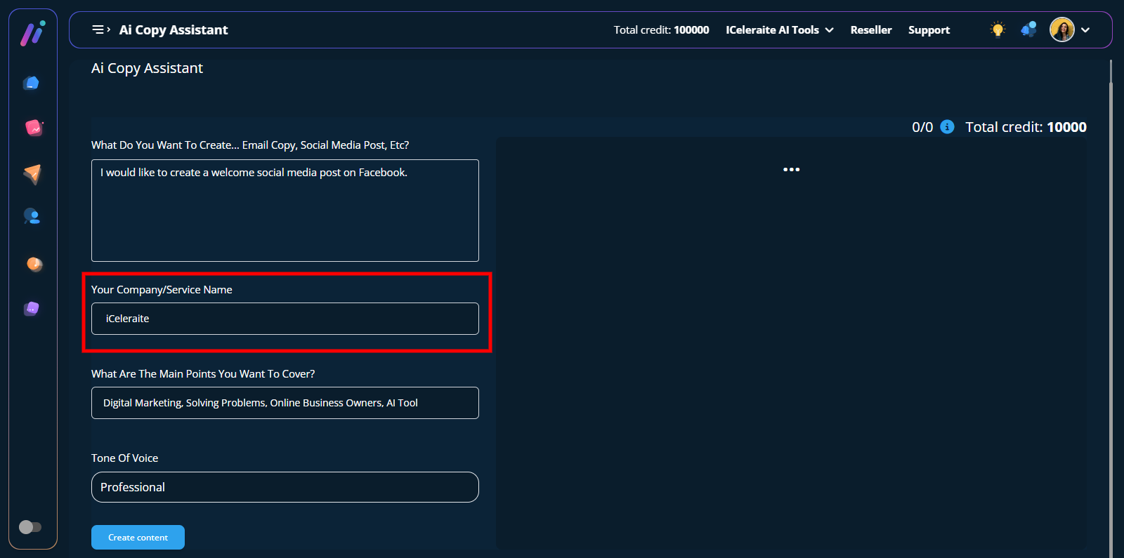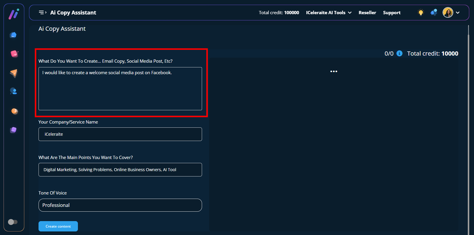 Note: Your response will be based on the kind of content you want the AI copy assistant to create for you. The example below is provided to give you a better understanding of what to tell the AI.