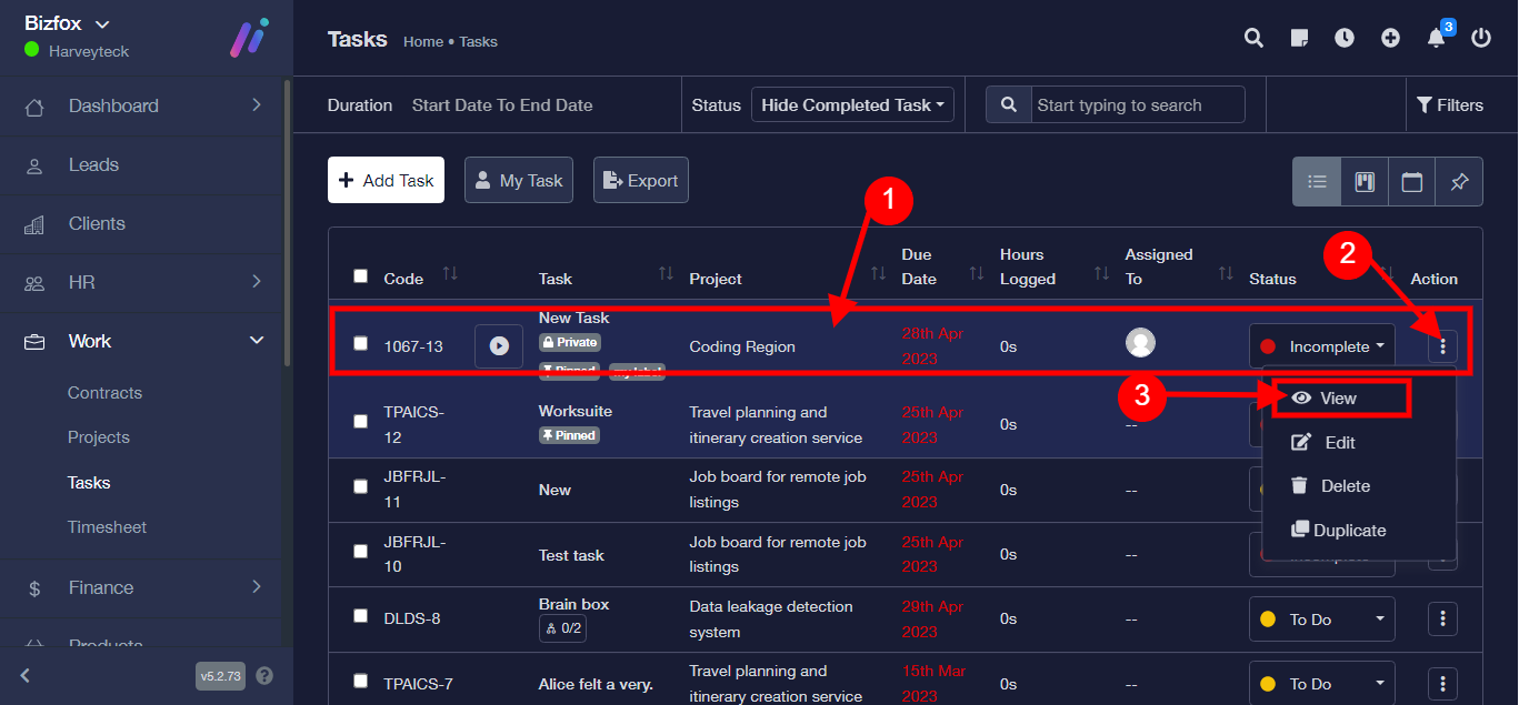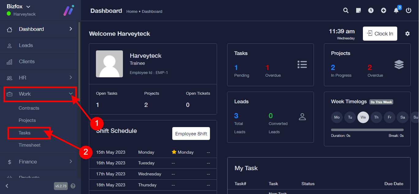 Step 1: After you’ve logged into your Business manager account, it leads you to the dashboard and there you get to see the left nav-bar and a table. On the left-nav bar click on “WORK” dropdown, It takes you to “Task” Click on “Task”
